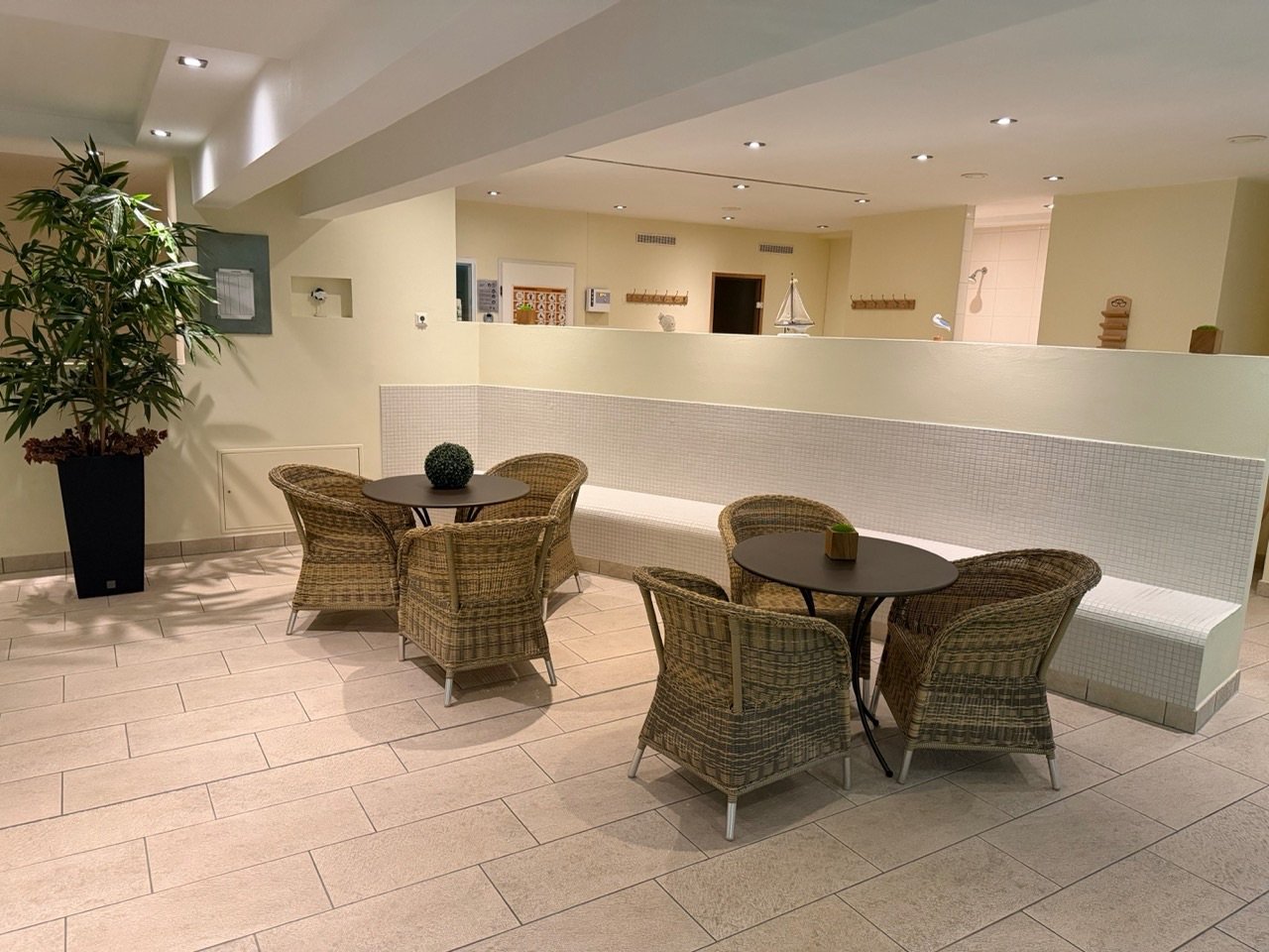 Ein besonderes Highlight ist der hauseigene Wellnessbereich: Schwimmbad mit Gegenstromanlage, Trocken- und Dampfsauna, Duschen, sowie einem Fitnessraum stehen Ihnen jederzeit zur Verfügung und sorgen auch an kühleren Tagen für pure Erholung. Nach einem Strandspaziergang oder einem erlebnisreichen Tag können Sie hier wunderbar entspannen und neue Energie tanken.